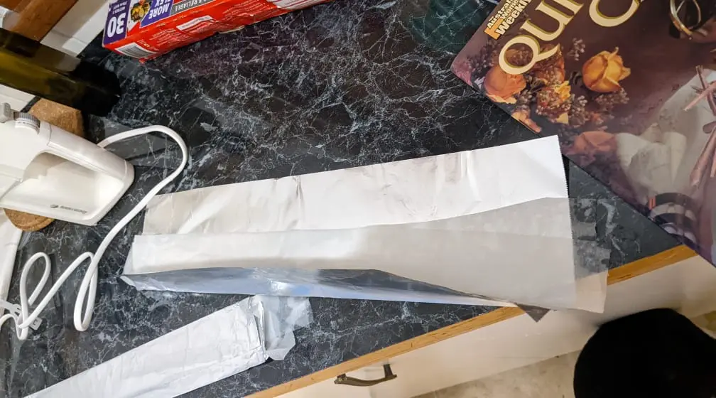 First I got some paper towel and checked whether it ould make it around the tin. It didn't so I chopped it in half to make 2 lengths. Luckily the width wasn't and issue as my tin is super shallow, so even a quarter of the width of a paper towel was still too big! To stop the paper towel burning I wrapped it in alfoil, again cut in half to give extra length. Before wrapping it, I wet the paper towelso that it was dripping wet. I laid it in the middle of the foil and folded the foil over it. Then I added an extra fold to make it fit under the lip of my baking tin. I placed the tin and wrapping on a baking tray to stop the wrapping from falling off!